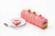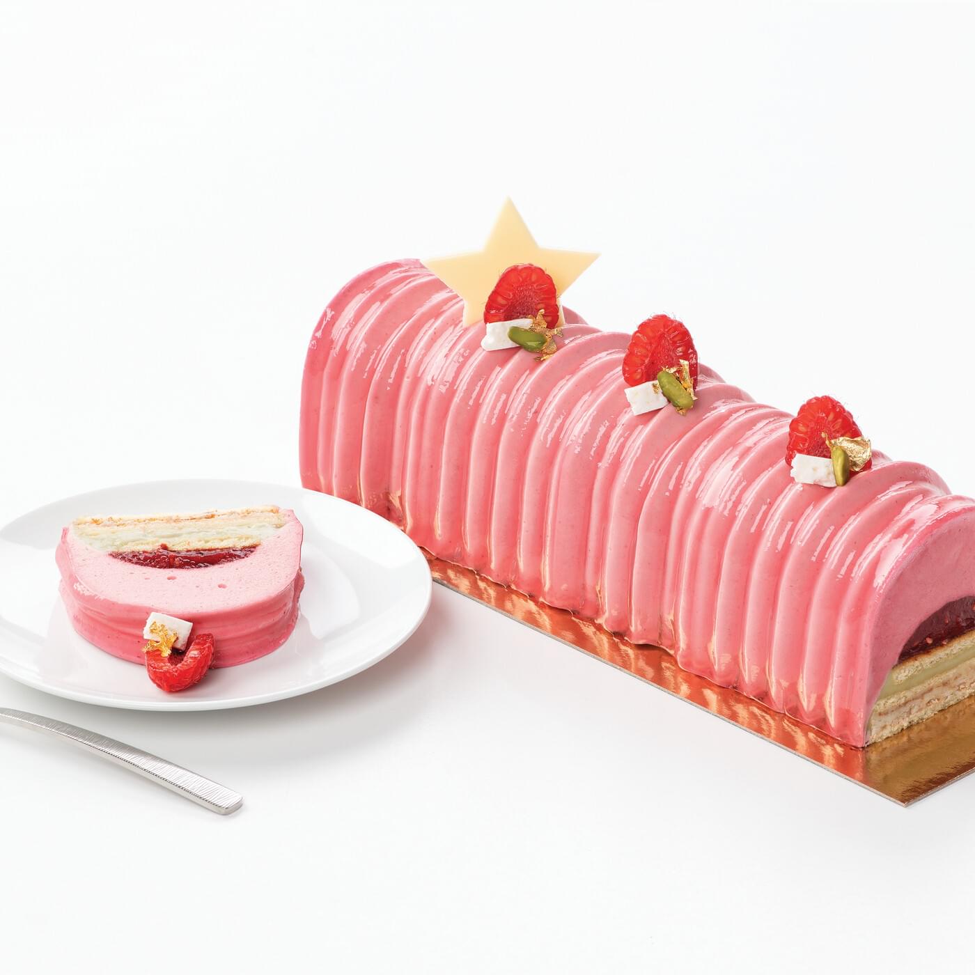 Mousse framboise, framboise pépin, crémeux pistache, feuillantine chocolat blanc, biscuit génoise et glaçage rose.