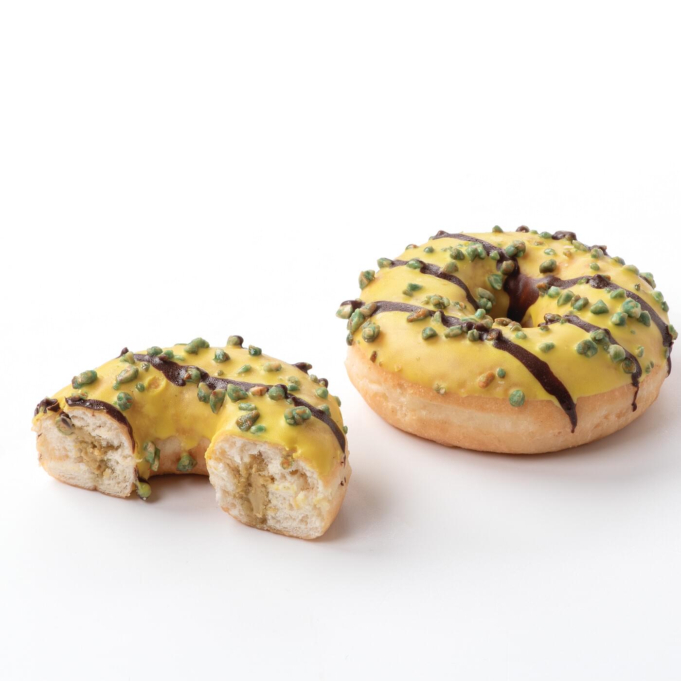 Donut avec fourrage pistache, rayures cacao et éclats d'amande colorés.