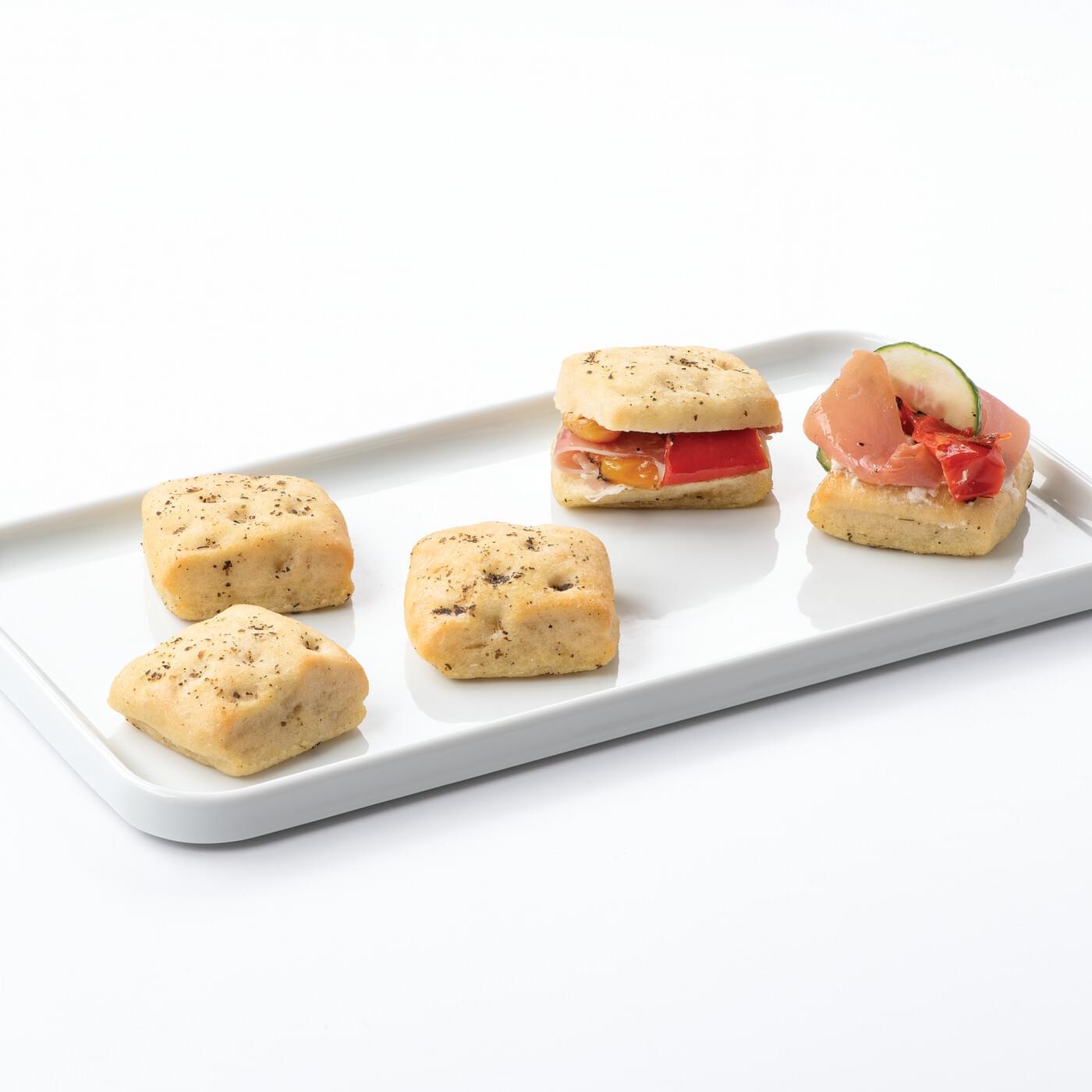 Pâte à foccacia avec levain et huile d'olive. Mélange aromatique: basilic, ail, fleur de sel de guérande.