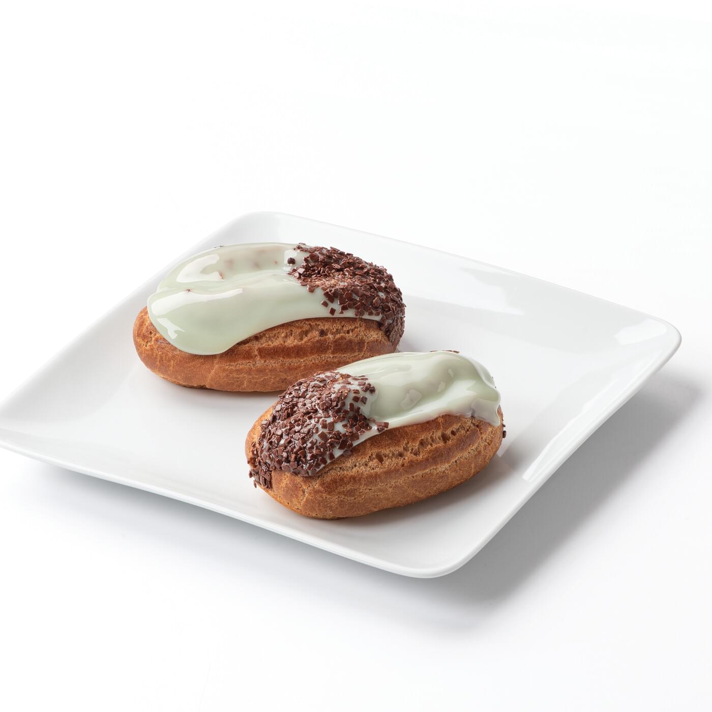 Pâte à choux, crème pâtissière à base de kirsch, fondant vert et décor chocolat.