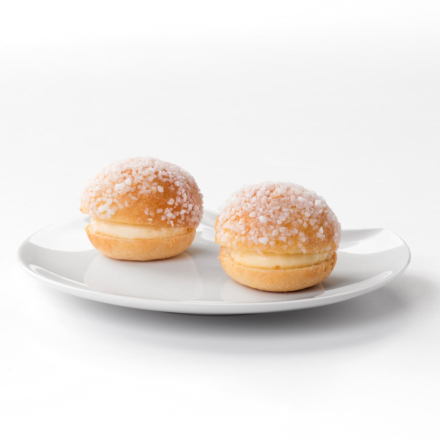 pâte à brioche, crème mousseline et décor sucre grain.
