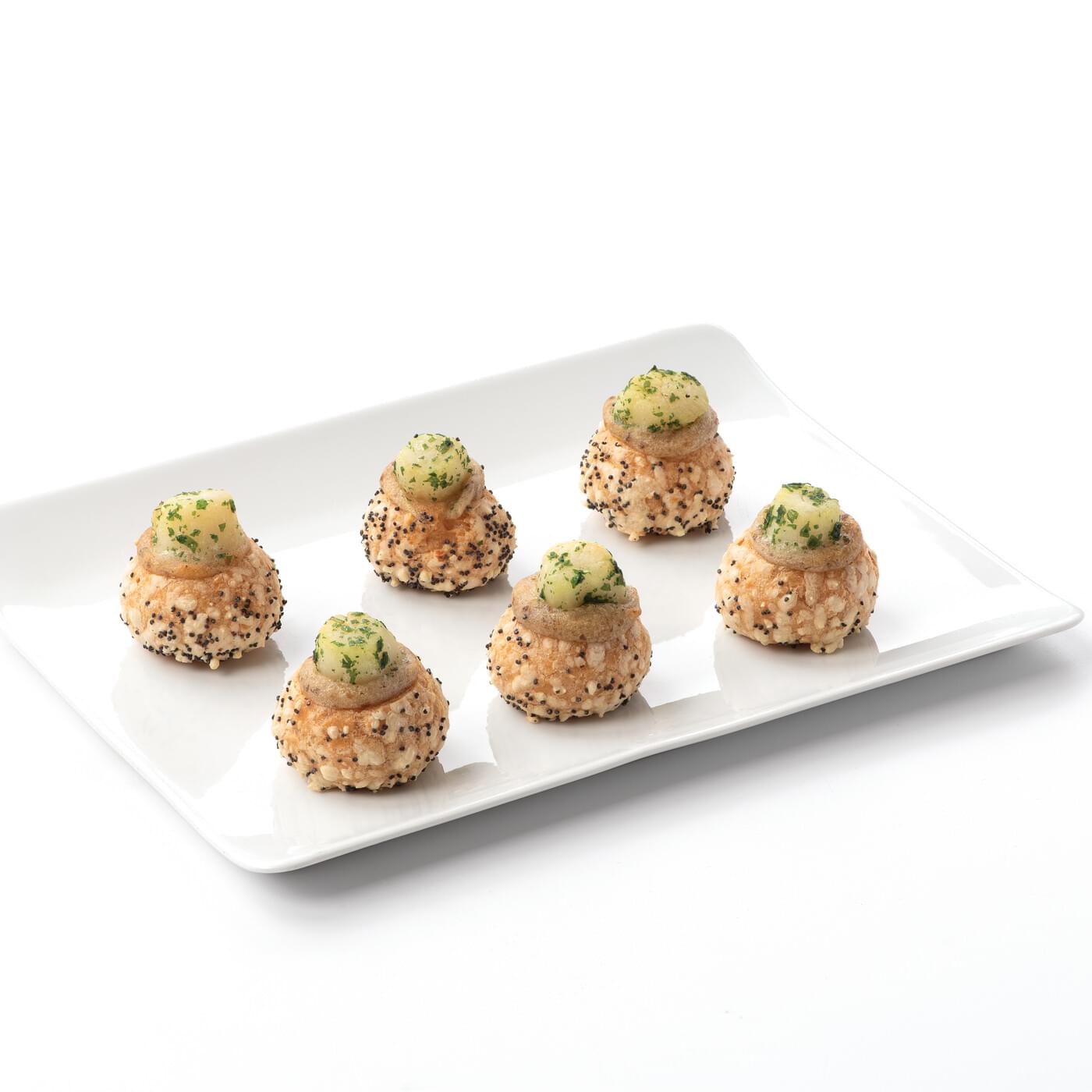 pâte à choux gratinée à l'emmental, aux graines de pavot, noix de Saint-Jacques marinées et sauce aux champignons aromatisée. 2 plateaux par carton.