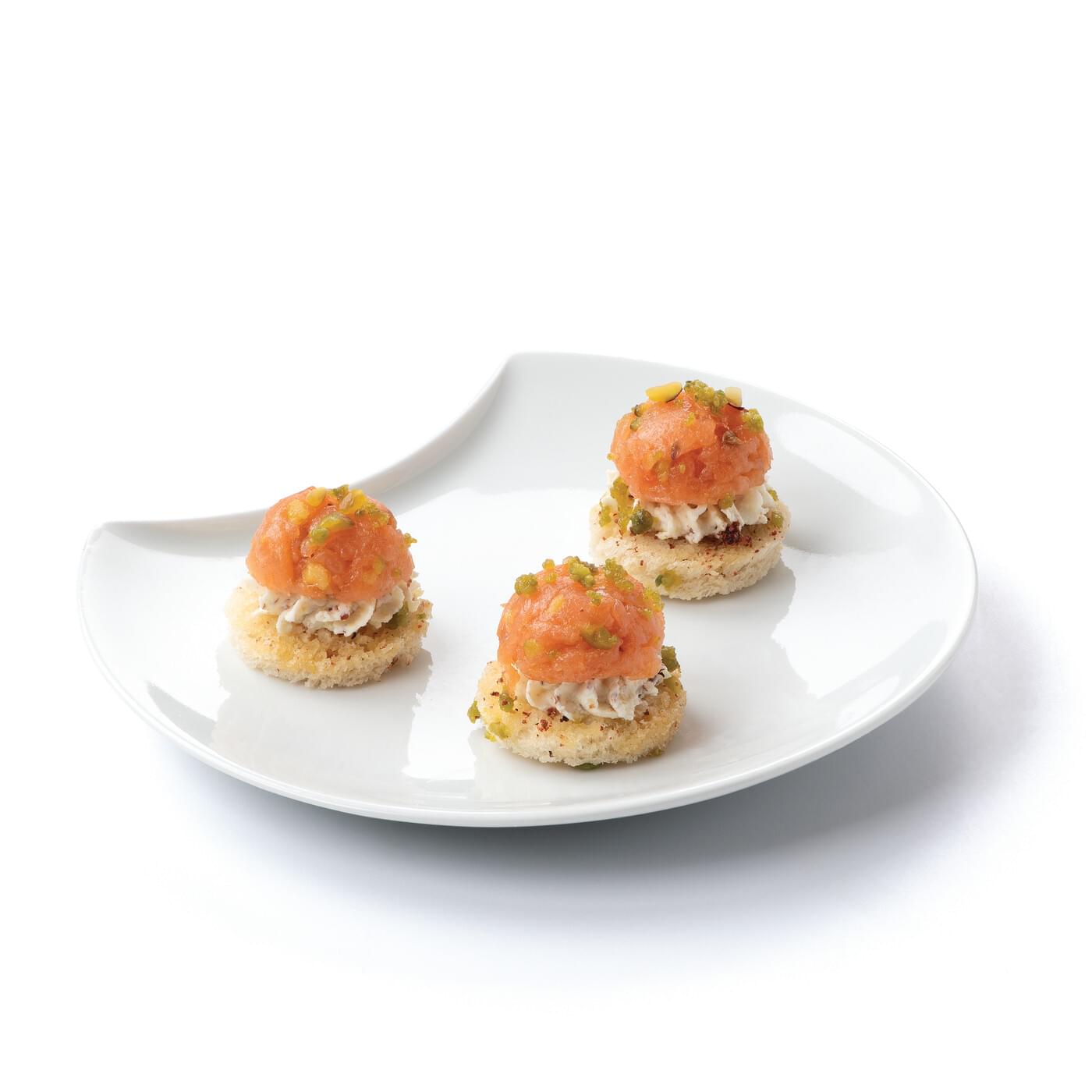 mini dôme de tartare de saumon fumé (Norvège), pistaches et kasha, sur base de fromage frais au miel et moutarde, sur pain de mie beurré.