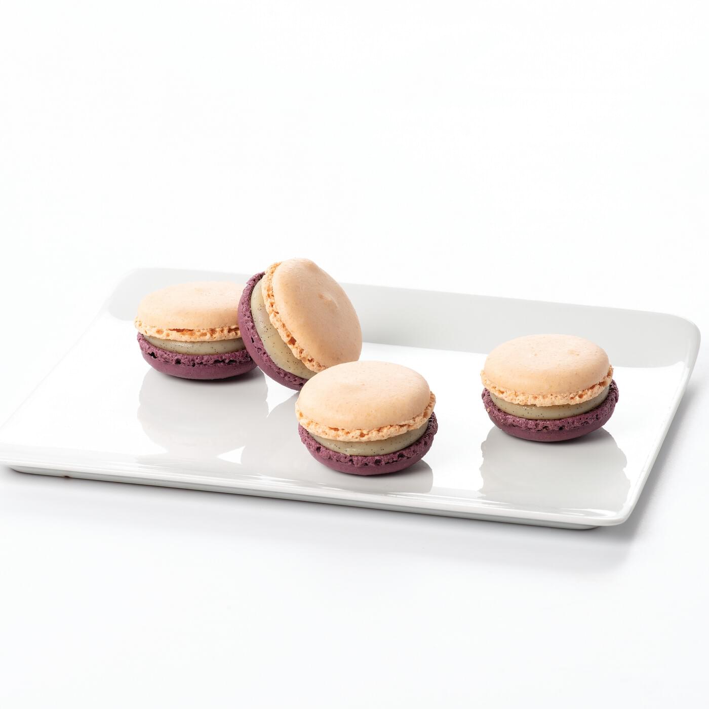 Coques de macaron bicolores : blanche et violette à base de poudre d'amandes, ganache vanille et insert myrtille.